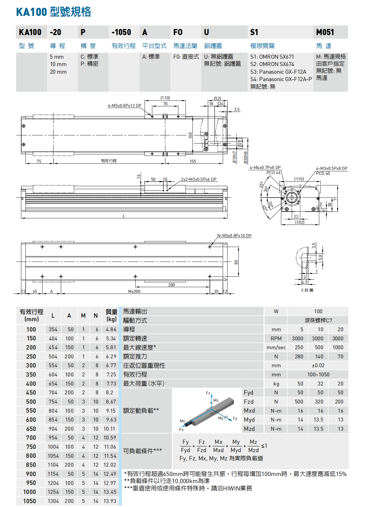 额定动负载方向定义如图(一)所示。型录中表列额定动负载(Fy, Fz, Mx, My, Mz)是相对于KA行走10,000 Km的寿命,为确保KA长期使用,建议儘可能在表列负载范围内使用。