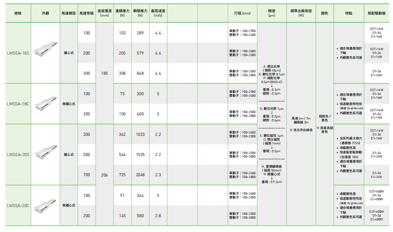 高刚性滑座.一体成形底座.永久式磁铁.隐藏式編碼器&限位感測器.大推力密度直线电机.高刚性导轨